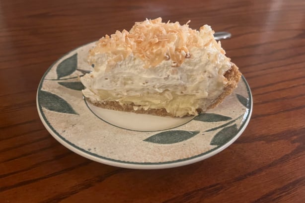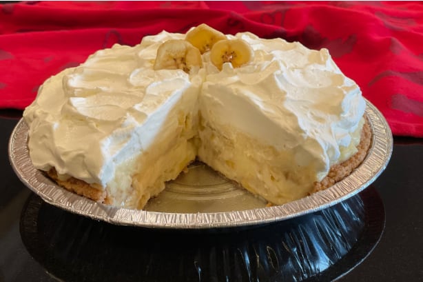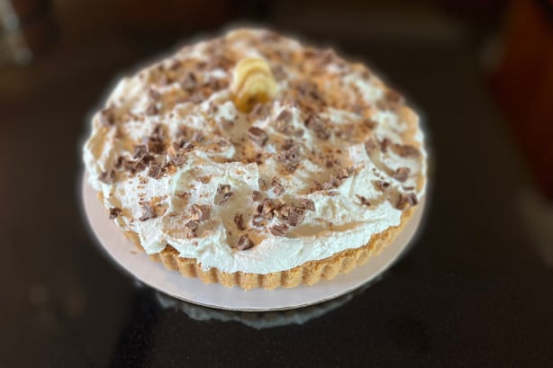 Toffee, banana, whipped cream in a graham cracker crust