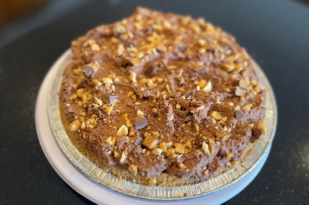 Whipped peanut butter cream covered with whipped chocolate ganache garnished with peanut butter cups